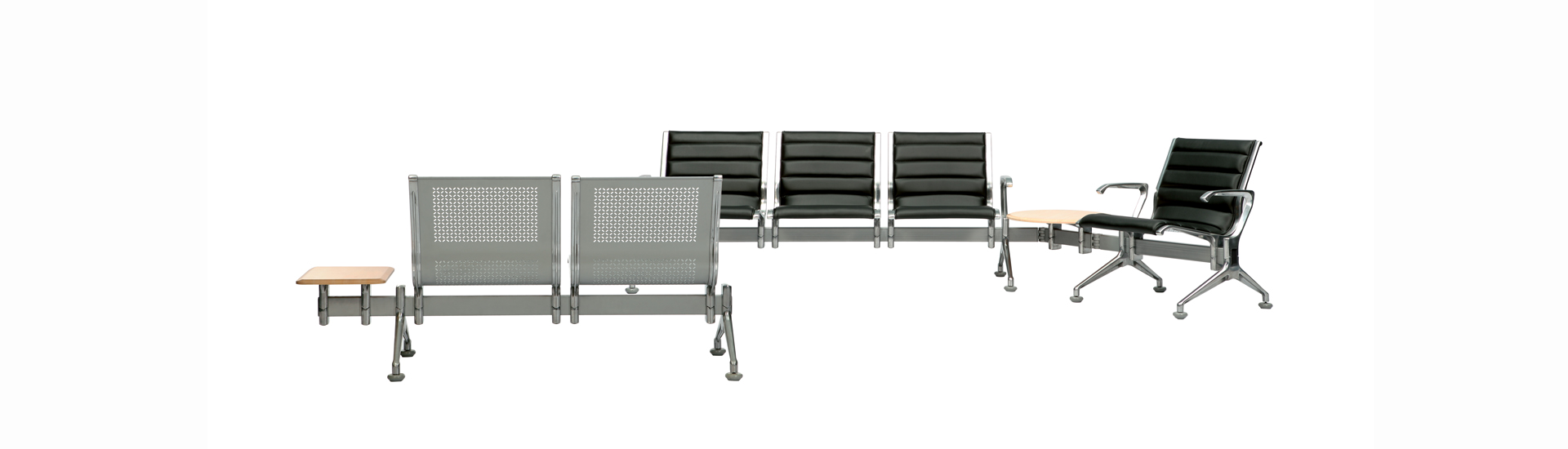 Voyage is a beam-type seating system. It provides a dramatic and durable seating solution for airport, stations, malls and museums. Voyage is available in two, three, four or more seats according to requirement with steel or cushioned or upholstered seats and PU integral foam pads. The seats are perforated steel finished in epoxy powder coating for low maintenance. These are mounted on a rectangular steel beam which allows long runs of seating. Individual seats can be linked together via a swivel joint at any angle with the turn table positioned on top of it.